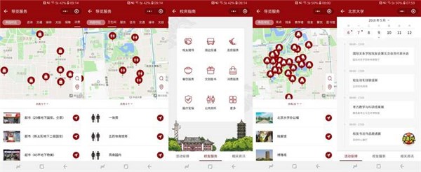 目前已覆盖30所高校的专属小程序则主要面向大一新生、参观游客、返校校园,以北京大学为例,“北京大学校园导览”小程序还上线了校庆指南专题页,你可以通过这个小程序查看每天的校庆活动安排,查询校园里校友接待站的位置。