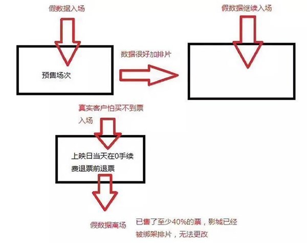 而此次《后来》退票事件的操作者使用了成本更低的方式。操作者先购入大量电影票,拉高影片预售票房,影院看到较好的预售数据就会增加排片,真实观众怕买不到票提前购票,再次拉高预售票房。影片上映当天,操作者利用在线票务平台的退改签机制退票,此时电影场次已经掺杂了正常售出的影票,排片无法取消,空出的座位很难再销售。这直接导致影院利益受损,也干扰了同档期其他电影的排片比例。