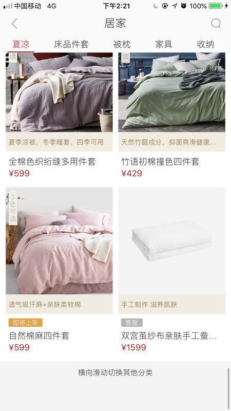 典型例子:网易严选由于严选的定位,某一个类目的产品的确是较少的,但是在滑动至最底部的时候给了用户文字提示-横向滑动切换分类。
